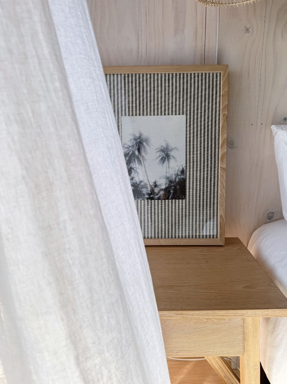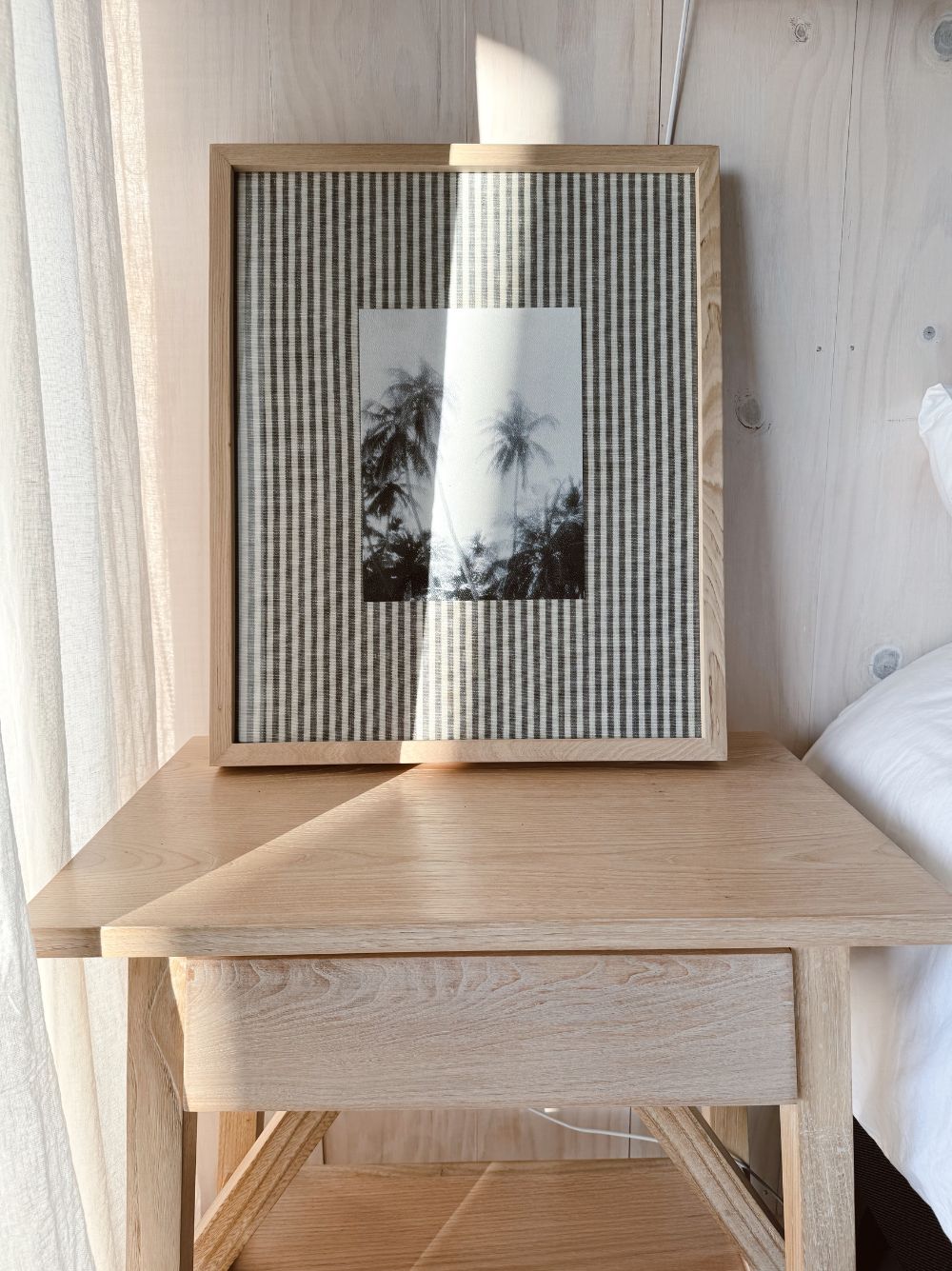 Enmarcado con marco caja color mañio natural de 2 cms de frente y 3 de profundidad,  fondo de género rallas